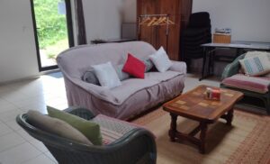 Equipement de la cuisine : plaque de cuisson vitrocéramique 3 feux, réfrigérateur table-top, un four à micro ondes, un four, cafetière, bouilloire, grille pain, nécessaire de cuisine et vaisselle.